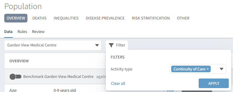 Scroll all the way to the bottom of the Overview page to the section titled Performance Indicator. Alternatively, you can filter your dashboard using the filter icon. Select your activity type as Continuity of Care and click Apply.