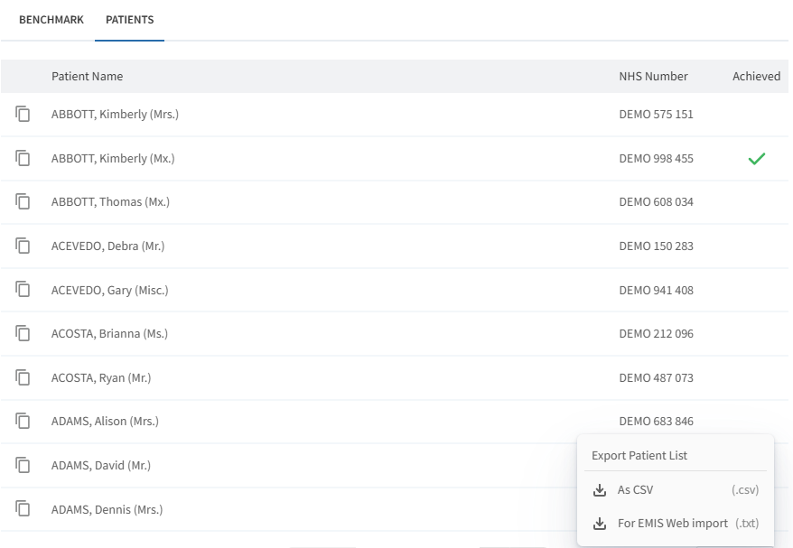 You can export the patient list out of Ardens Manager using the Export function at the bottom of the NHS numbers.