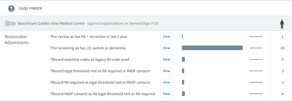 There are a series of case finder searches available to help practices identify any patients who may require reasonable adjustments and who have not yet been coded appropriately.