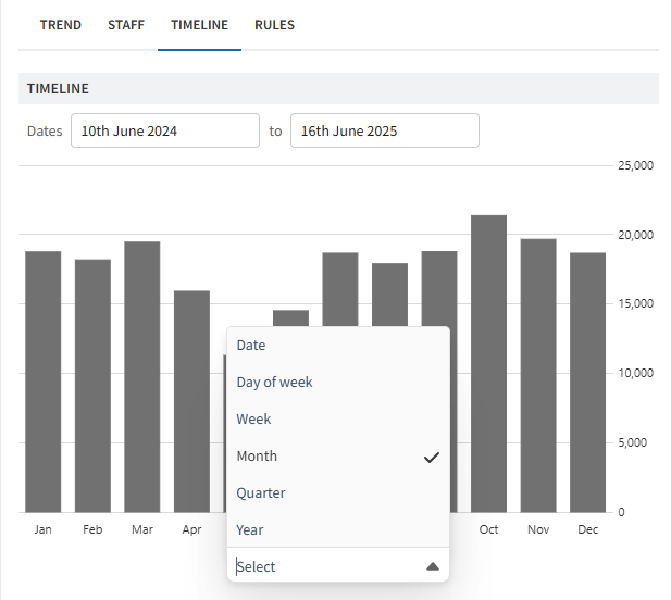 The Timeline tab can provide insights on the appointment data. For example, applying a context filter by 'month', you can visualise appointment numbers by month over the past year, making it easy to spot trends.