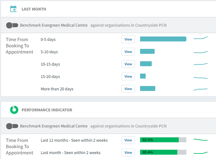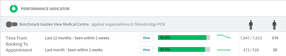 Monitor your performance for patients seen within two weeks by visualising how many of your patient appointments occurred within this timeframe. The data will be represented as a percentage of all appointments and displayed in a progress bar, accompanied by a 'spike line' to show trends (i.e., whether the percentage is increasing or decreasing). The final two patient columns will allow you to track the number of appointments that have met this target out of the total appointments, as well as the number of appointments that have not met this target.