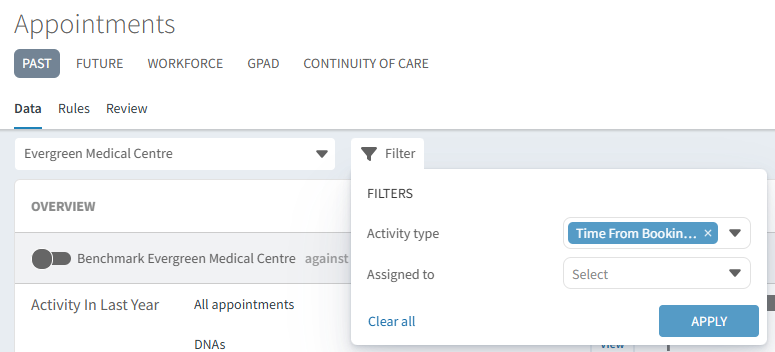 Alternatively, you can filter your dashboard using the filter icon. Select your activity type as Time From Booking To Appointment and click Apply.