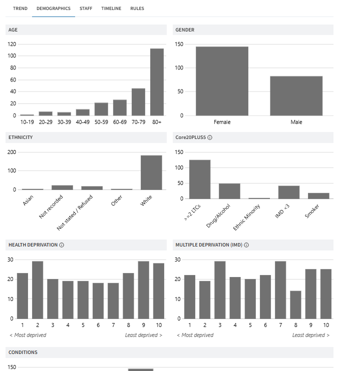 Use the Timeline tab to monitor where the volumatic areas appear. Applying a context filter by 'month', you can visualise appointment numbers by month over the past year, making it easy to spot trends, for example, did attendances in this cohort increase during the winter months?