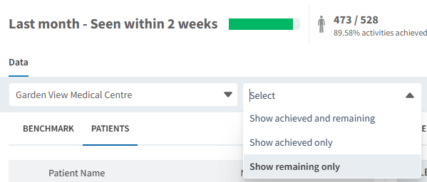 Review the data for patients who have not met this criteria to look for insights on how to improve access for these patients. Identify those patients by clicking on View and navigating to the Patients tab. From the drop-down filter, select 'show remaining only'.