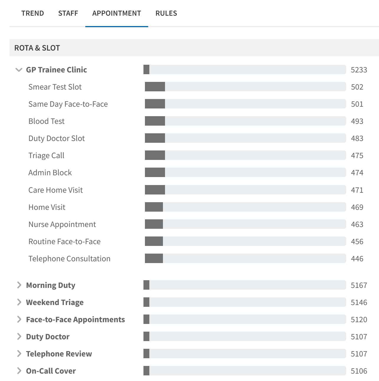 Use the Appointments tab to understand which slot types were utilised and evaluate their impact on the rota they have been allocated to.