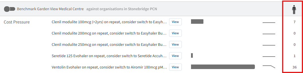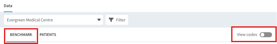 Your data can be viewed through Code Breakdown, which helps prioritise tasks by focusing on inhalers by group and dose. To access the code breakdown, click on the Benchmark tab, then toggle View Codes.