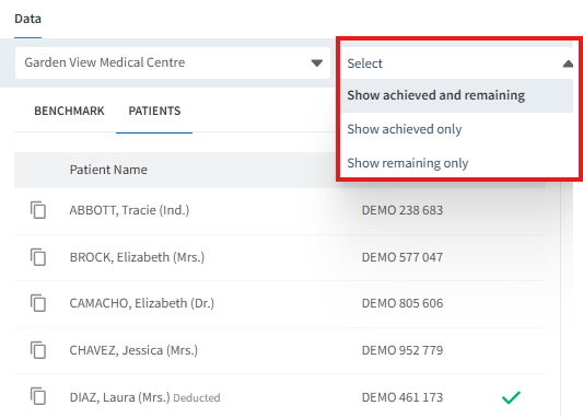 The patient list can be filtered based on the task you are performing. When reviewing a performance indicator report, use the drop-down menu to switch between the full cohort and the patients needing outstanding drug monitoring. For static reports, such as safety alerts, a single list is available showing the number of identified patients.