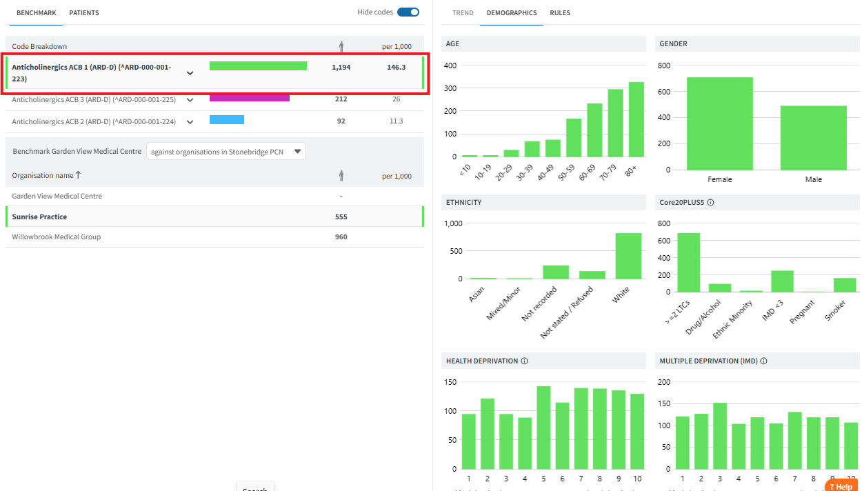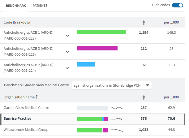Your data can be analysed using Code Breakdown, which helps prioritise tasks by focusing on medications by group and dose. To access the code breakdown, click on the Benchmark tab, then toggle View Codes.