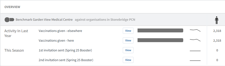 The Overview section will present the overall status of the current programme. It will include a breakdown of invitations and the number of vaccines administered, both in practice and elsewhere.