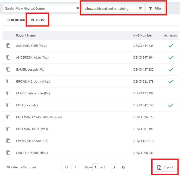 Select the PATIENTS tab to view the list of patients. From here you are able to filter the patient list further for a more targeted approach using the dynamics from the Demographic breakdown tab.