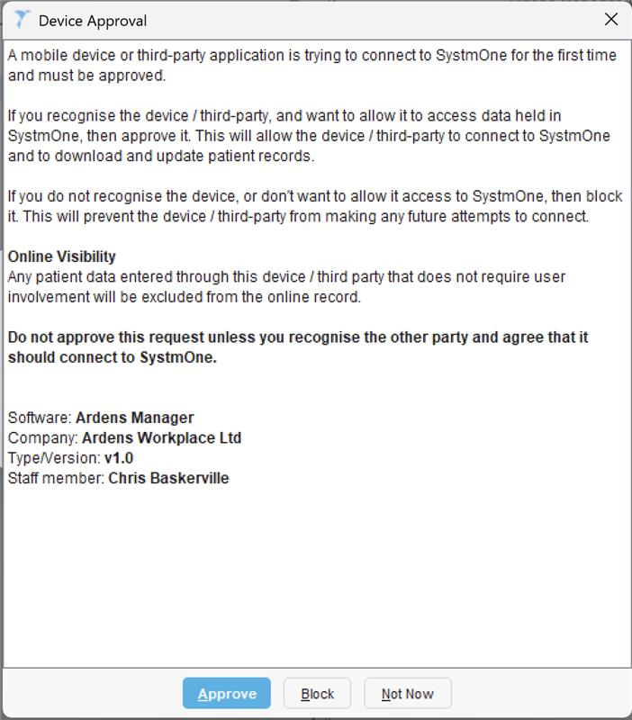 - Once you have completed the initial installation steps above Ardens Desktop will attempt to connect to SystmOne. On the first connection, you will be required to approve the device connection in SystmOne.