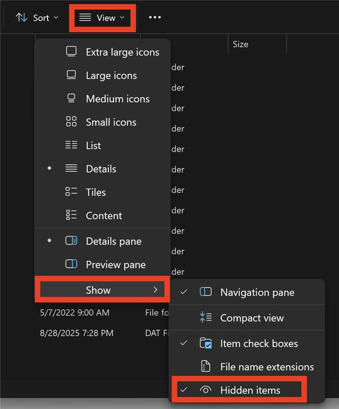 5. Enable "Hidden Items" in the View menu