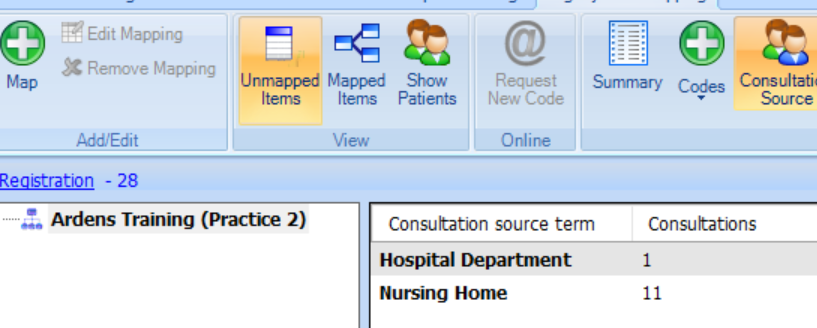 - This will list all unmapped items. Right-click on the consultation sources you want to map, click Map Consultation source and search for the required source. For large numbers, we recommend mapping them to ‘GP Surgery Consultation’ or ‘Admin note’.
