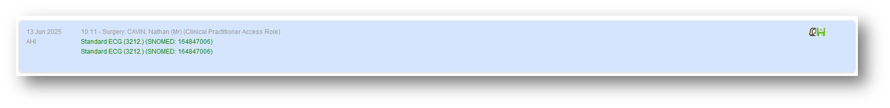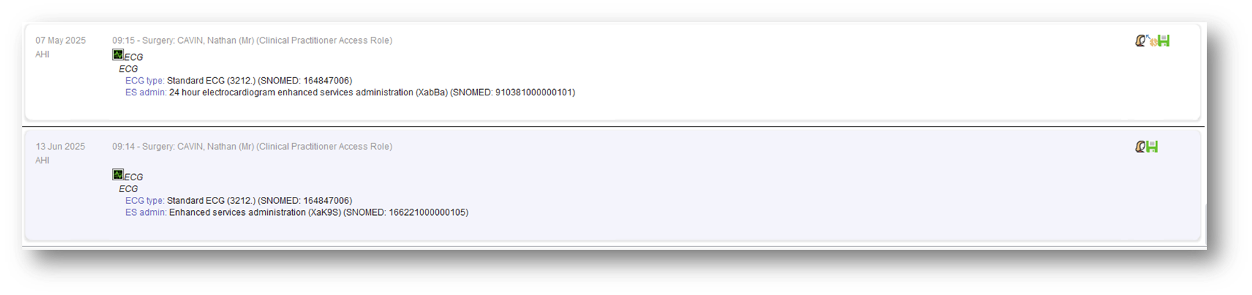 - Within SystmOne, each separate consultation or data entry on the Journal will be recorded as an 'event' within Ardens Manager. Based on the screenshot below, there are two distinct entries for an ECG procedure. Therefore, this will be considered as two separate ECGs for payment purposes.