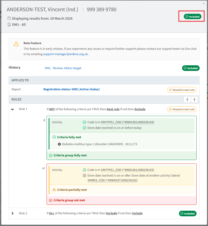 Ardens Manager includes the Check Patient feature to give full visibility into how report logic applies at an individual patient level.